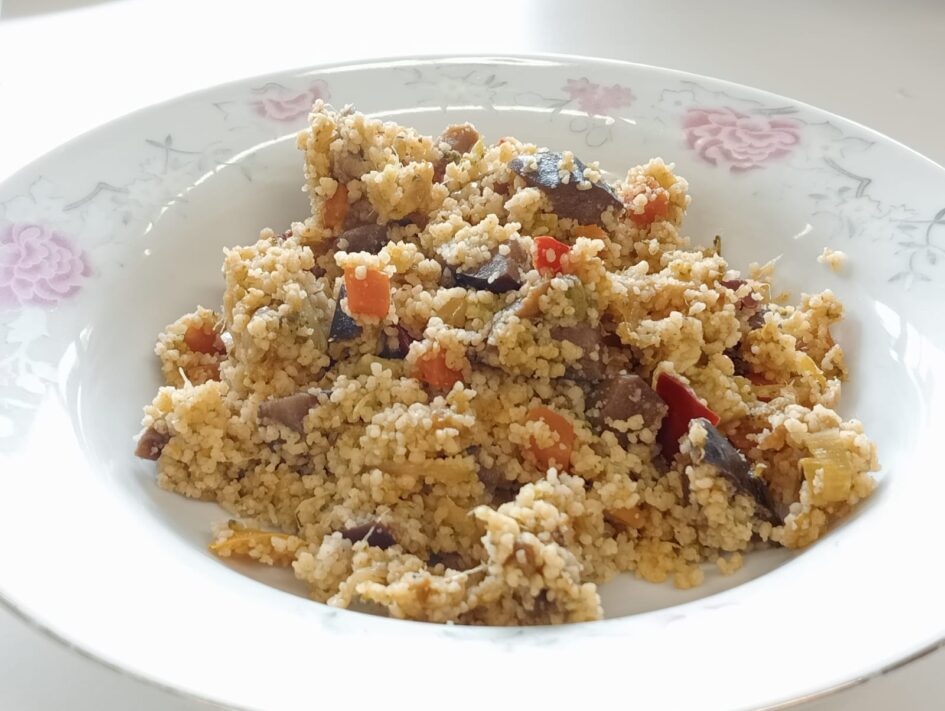 - Altrament, en un cassó posem aigua a bullir, condimentada amb un raig d’oli, sal, pebre negre, un gra d’all i una fulla de llorer. Per cada part de cuscús utilitzem dues parts d’aigua. Col·loquem la part de cuscús en una safata plana, quan l’aigua comenci a bullir l’afegim al cuscús i ho deixem reposar tapat amb un drap de roba durant 5 minuts. Passat el temps ho barregem amb una forquilla.