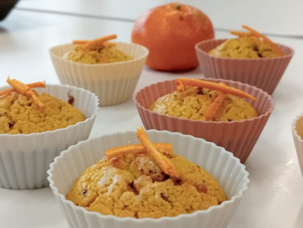 INGREDIENTS PER A 8 UNITATS Farina 300gMandarines 4Llevat químic en pols 12gOus 2Sal 1 pessicLlet 100mlOli d’oliva 100mlNous (opcional)Xocolata negra (opcional)Sucre (opcional) ELABORACIÓ