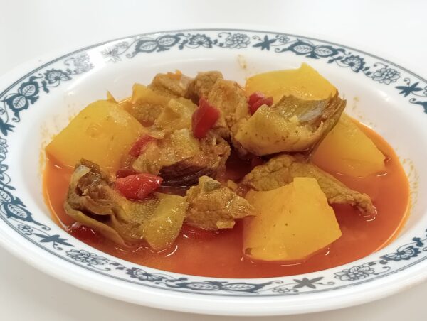 INGREDIENTS PER A 5 PERSONES Vedella 400gPatata 500gCarxofes 4Ceba 1All 2Pebrot vermell – una porcióPimentó, pebre negre i salFulla de llorerOli d’olivaAigua o brou ELABORACIÓ