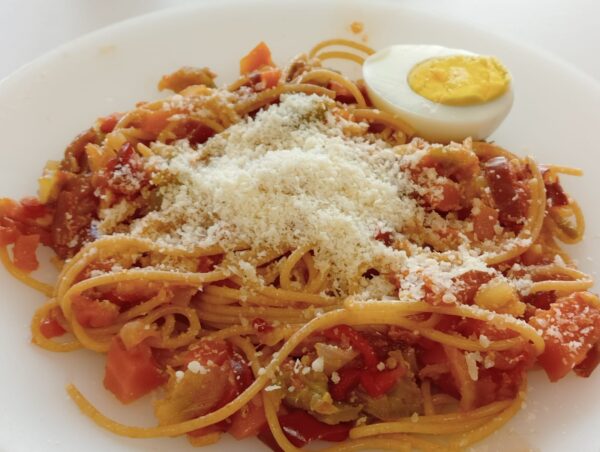 INGREDIENTS PER 5 PERSONES Espaguetis integrals (230 grams).Pastanagues 2Pebrot verd 1Pebrot vermell 1Ceba 14 tomàquets madurs2 allsCarabassó 16 ousSal, pebre i oli d’oliva ELABORACIÓ