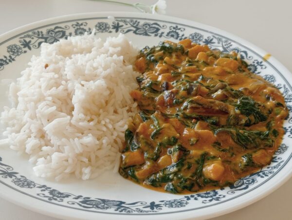 INGREDIENTS PER A 4 PERSONES AlbergíniaEspinacsCebaAllGingebreTomàquet trituratLlet de coco (400ml)Curri el pols 1 culleradetaCúrcuma ½ culleradetaComí en pols ½ culleradetaPimentó ¼ culleradetaOli d’olivaSal i pebre negreArròs basmati ELABORACIÓ
